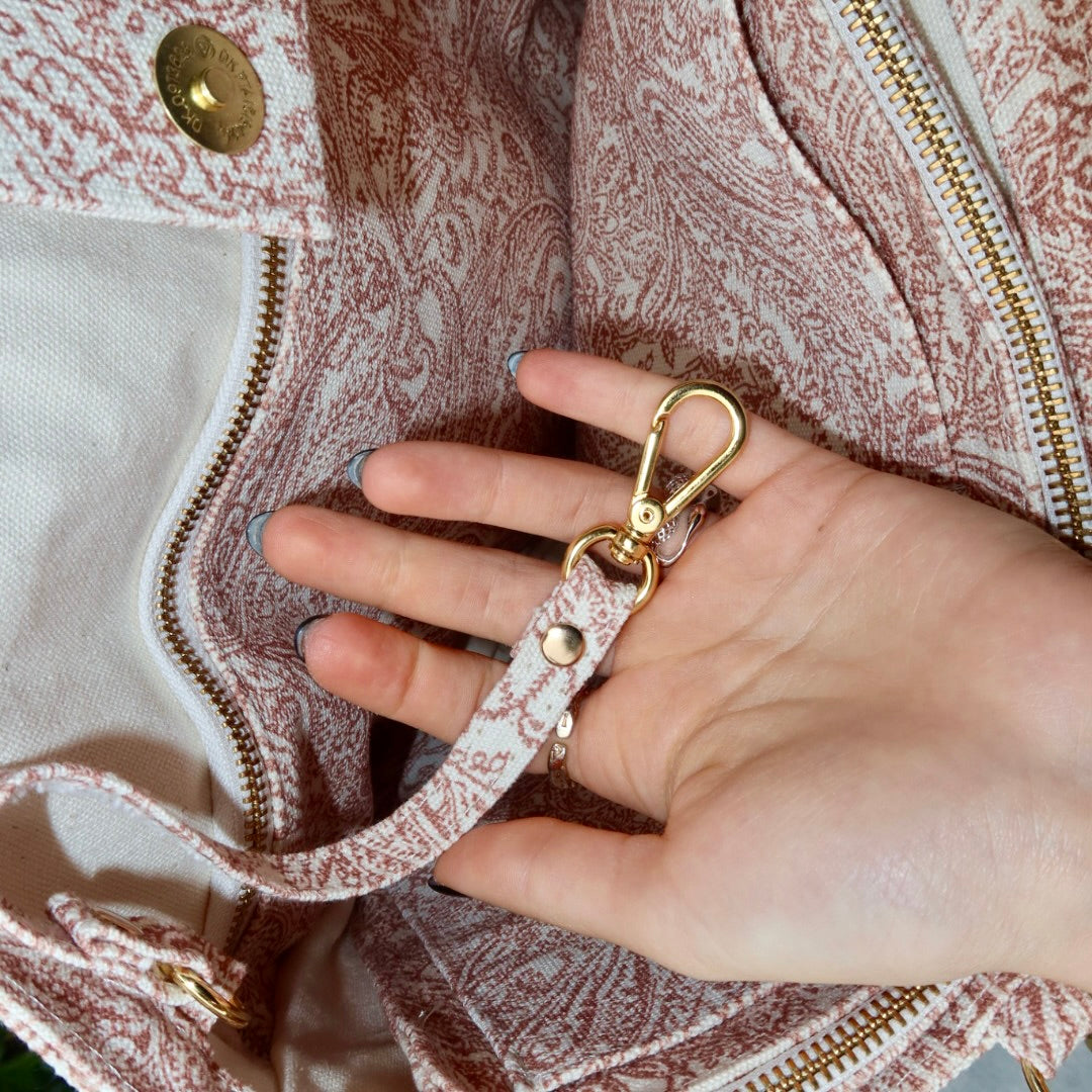 Bolsa média estilo tote em lona de algodão no modelo Katrin na cor arabesque terracota e alça de corrente dourada e couro legítimo em marrom.
