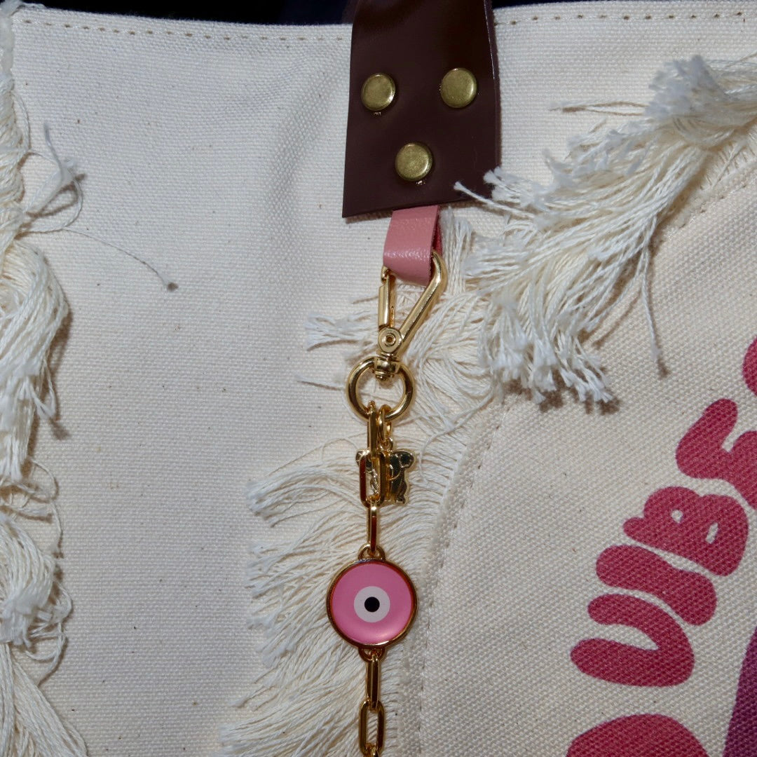 Bolsa grande estilo sacola no modelo Wallow em lona crua, com estampa de olho grego rosa e alças de couro legítimo em marrom escuro
