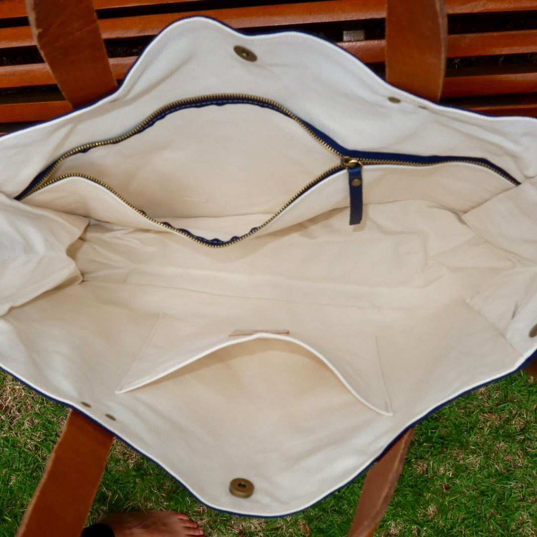 Lona de algodão e alças de couro genuíno.