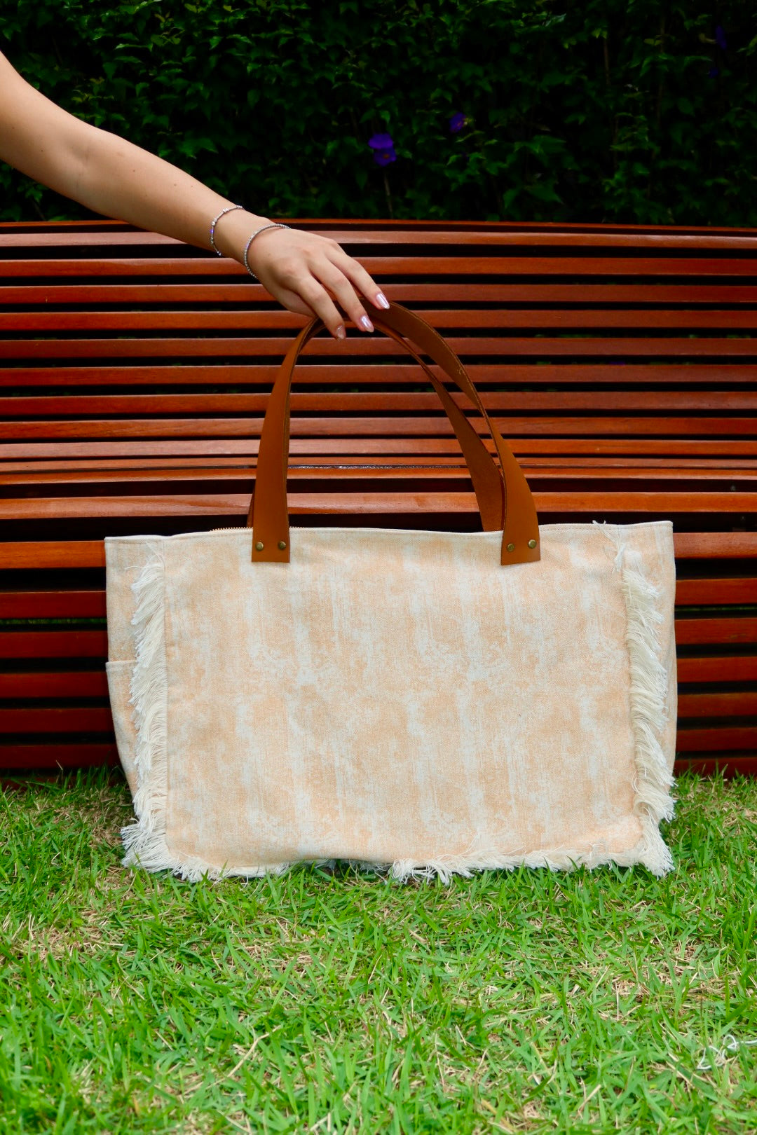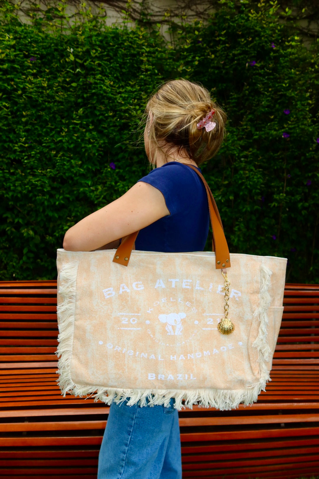 Bolsa grande estilo sacola no modelo Wallow na cor laranja, com estampa em silk branco, e alças de couro legítimo em caramelo.