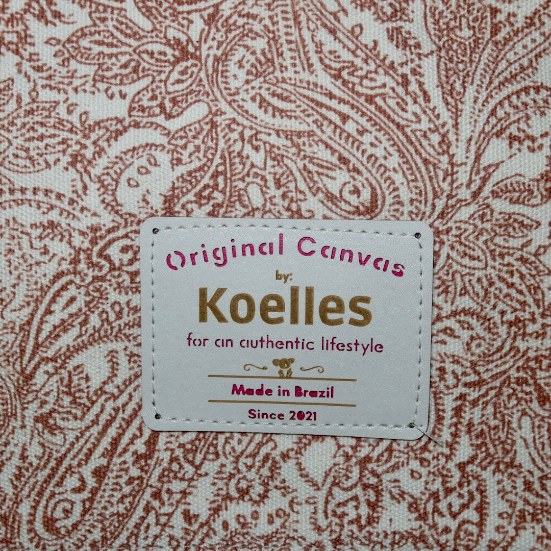 Bolsa média estilo tote em lona de algodão no modelo Katrin na cor arabesque terracota e alça de corrente dourada e couro legítimo em dourado.