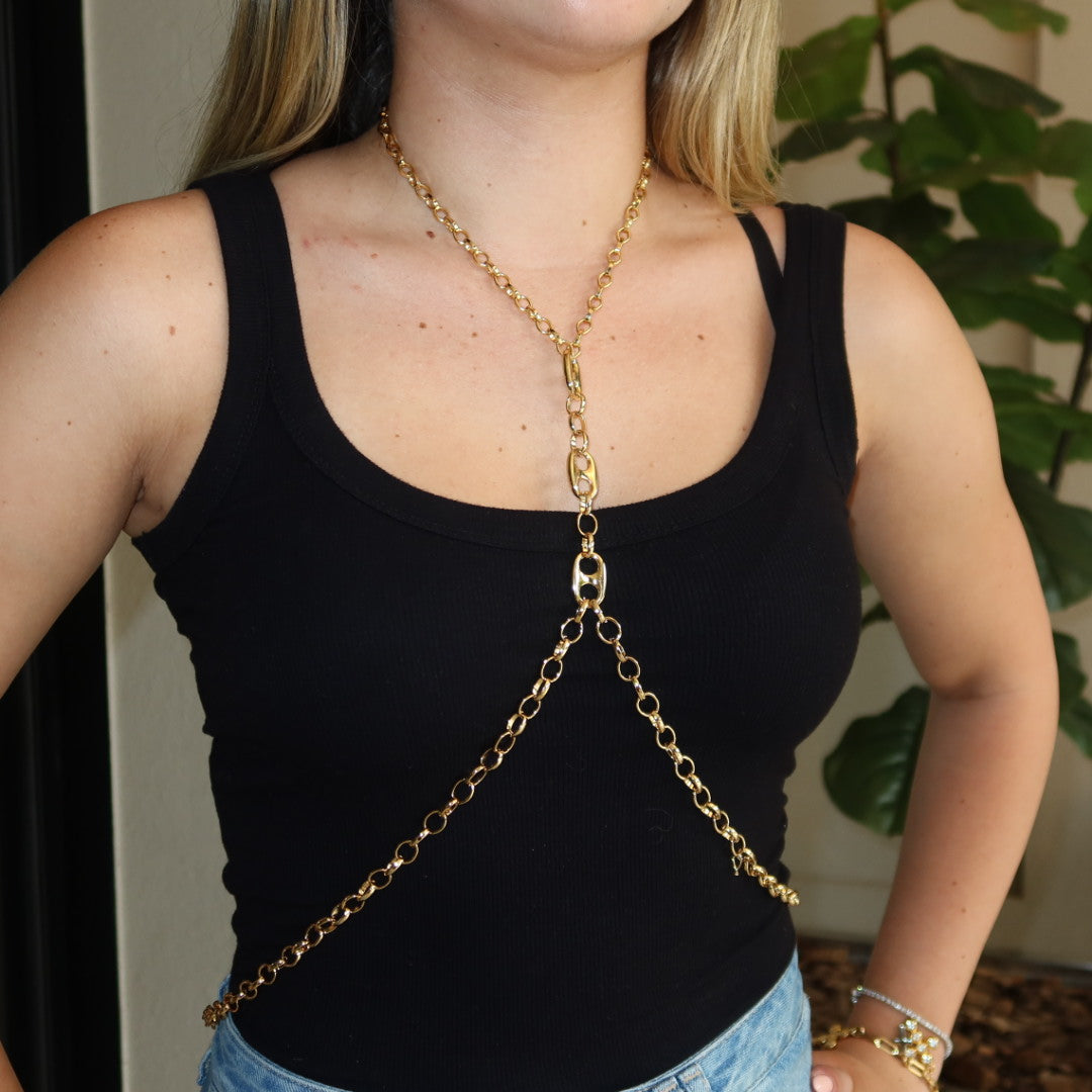 Body chain em corrente dourada com três pingentes que imitam lacres de garrafinhas de metal, também em dourado no centro. Fechamento em mosquetão.