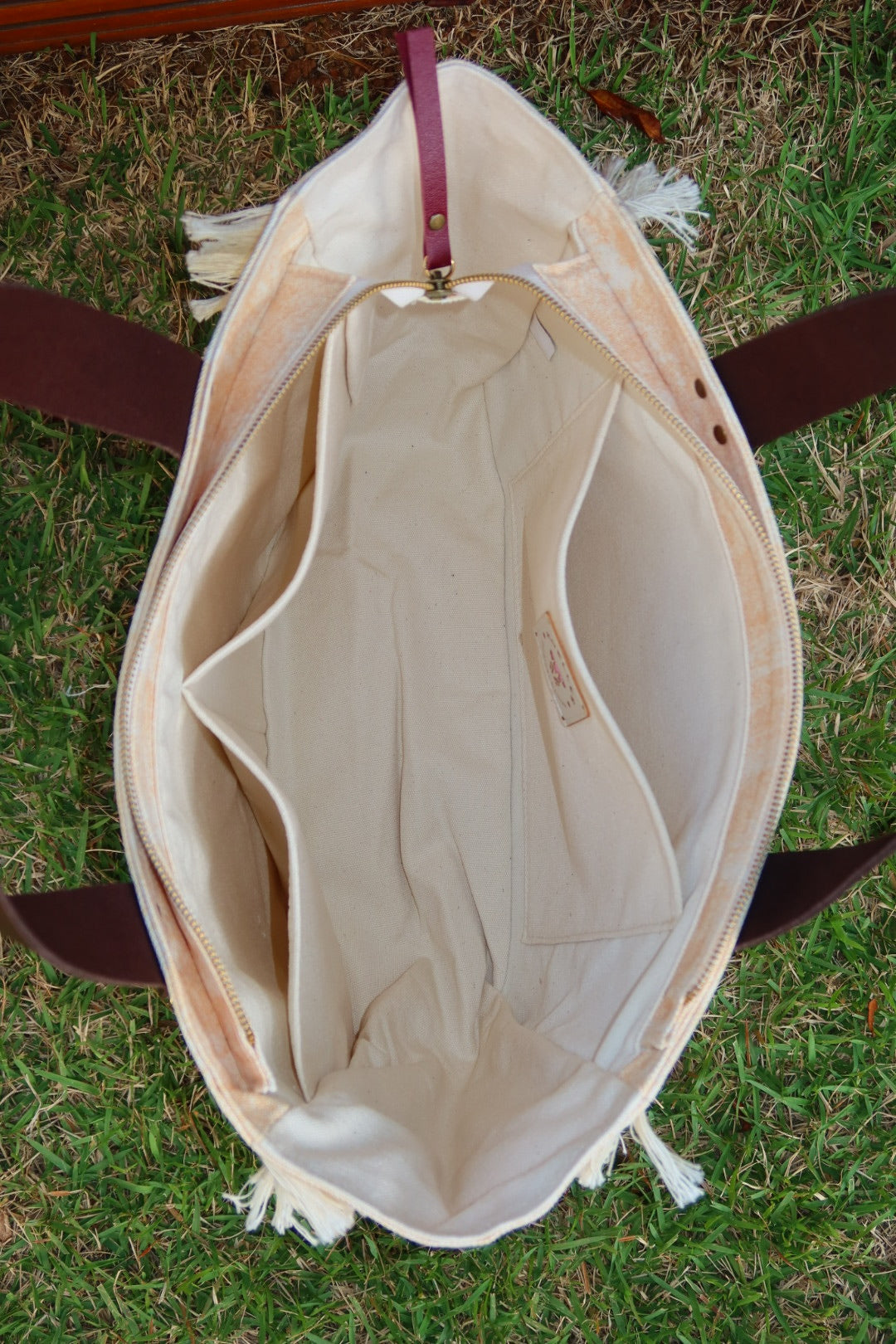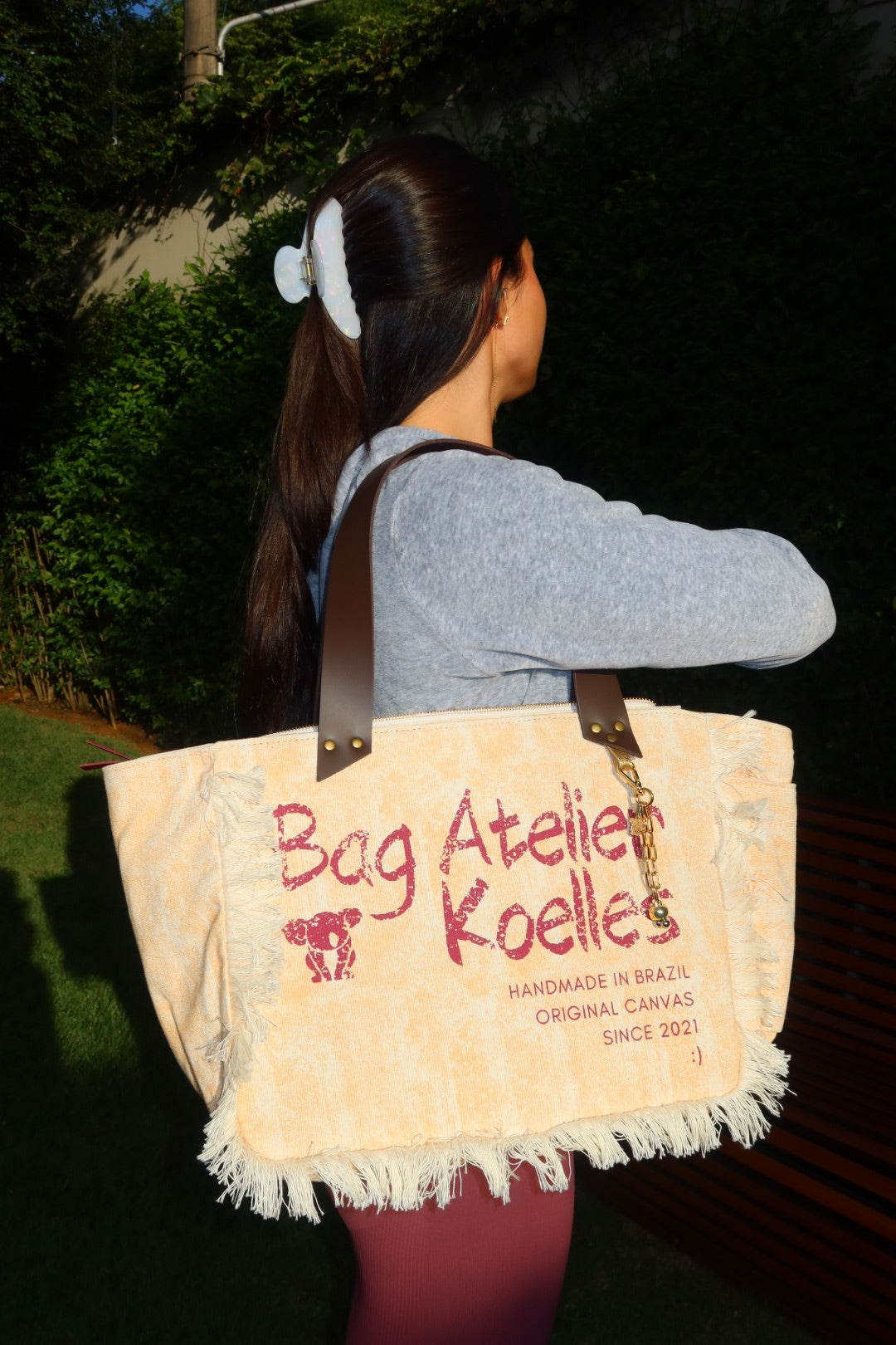 Bolsa média em lona de algodão estilo tote no modelo Nuna na cor laranja, com estampa em silk vinho e alças de couro legítimo em marrom escuro.